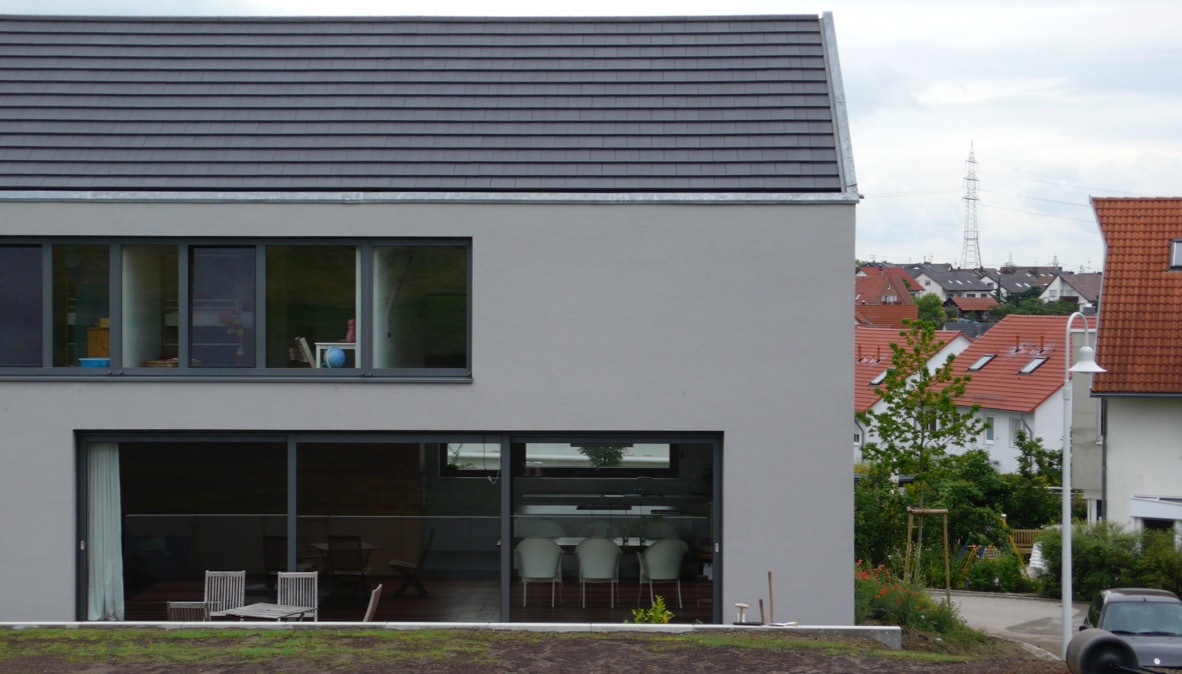 Dachneigung zwischen 27 und 35 Grad, Fensteröffnungen ohne erkennbare Ordnung, Fassadenanstrich in Tarnfarbe, schwarzes Dach. Der großzügige Eingangsbereich mit vollverglaster Fassade und Vorplatz hält den Kontakt zum Umfeld.