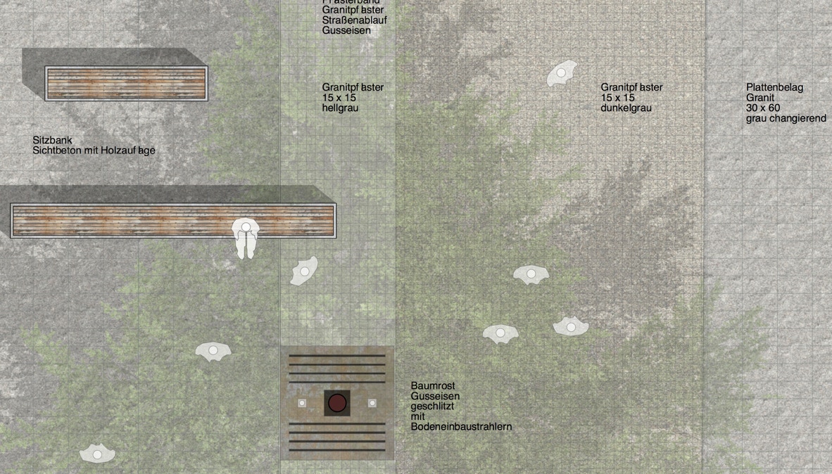 Der Hauptzugang am Braker Weg wird durch eine leicht geneigte, dreieckige Platzfläche gekennzeichnet. Stufen entlang der Wegeverbindungen machen die Platzfläche erlebbar und bieten Sitzgelegenheiten zum Verweilen. Auf der Westseite des Platzes entlang der Raumkante entsteht eine Achse, die den Übergang "Bahnhaltestelle" und den Anschlusspunkt "Johannes-Schuchen-Straße" direkt miteinander verknüpft.