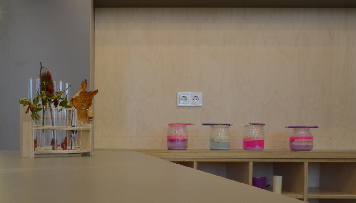 Das Raumkonzept wurde in Anlehnung an die Gestaltung der Grundschule im 2. Obergeschoss entwickelt. Der große Eingangsraum ist mit einem zentralen halbhohen Einbaumöbel, dass die Funktionen Garderobe, Küche und Labor anbietet, in Raumzonen unterteilt. Die Garderobe begrenzt den Eingangsraum, die Küche ist zum Marktplatz hin ausgerichtet.