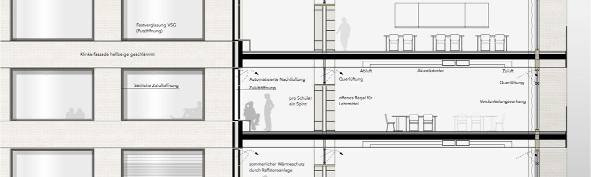 Der 4-geschossige, L-förmige Baukörper der Gemeinschaftsschule übernimmt die geplante Gebäudeflucht entlang der Konrad-Zuse-Straße und umschließt das Areal auch auf der Nordseite. Der 3-geschossige Baukörper der Grundschule und Kindertagesstätte bildet den südwestlichen Abschluss und vermittelt in Höhe und Form zu der geplanten Bebauung in zweiter Reihe sowie zum Grünstrahl.