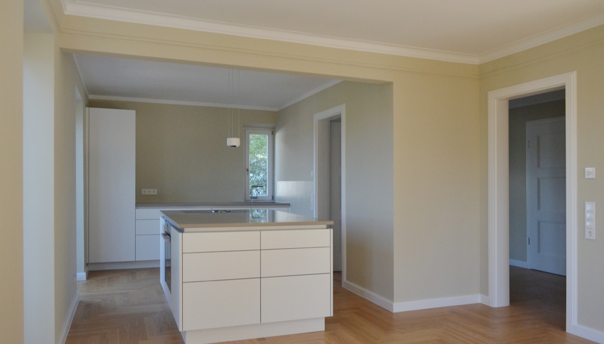 In diesem Mehrfamilienhaus aus den 30 Jahren wurde die Wohnung im Gartengeschoss kernsaniert. Die Raumzuschnitte wurden hierbei kaum verändert, lediglich die Küche mit dem Wohnraum verbunden. Eine zusätzliche Fensteröffnung auf der Strassenseite öffnet den Blick über die Stadt. Eingriffe aus den 60er Jahren konnten rückgebaut und die ursprüngliche Fassadengliederung wiederhergestellt werden.