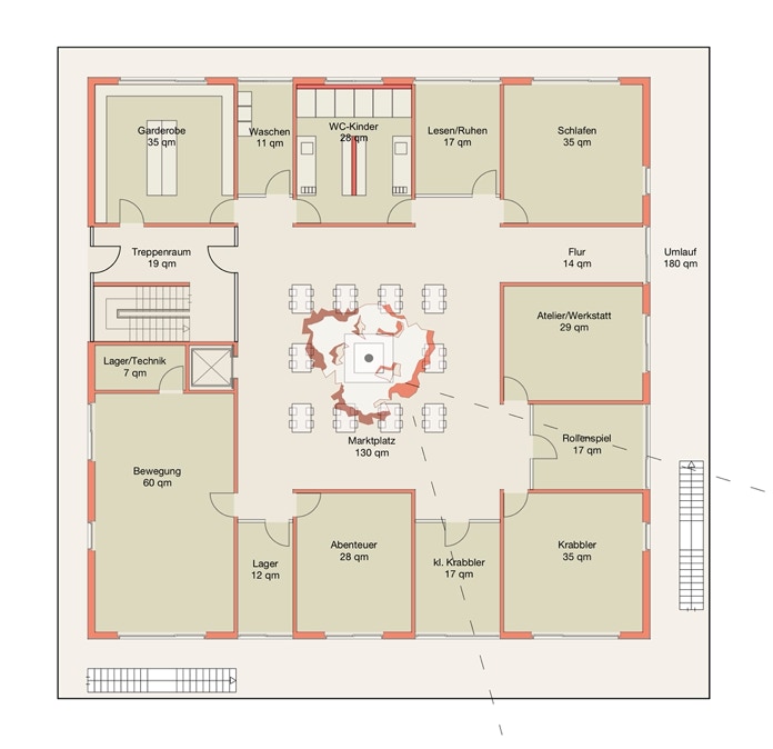 Zentraler Raum jeden Geschosses ist der Marktplatz. Funktions- und Nebenräume gruppieren sich in loser Folge, mal als geschlossenes, mal als offenes Raumelement um diesen zentralen Bereich. Die raumhohen Verglasungen öffnen den Innenraum nach aussen, je nach Bedarf können Aussenflächen in den Betrieb integriert werden.