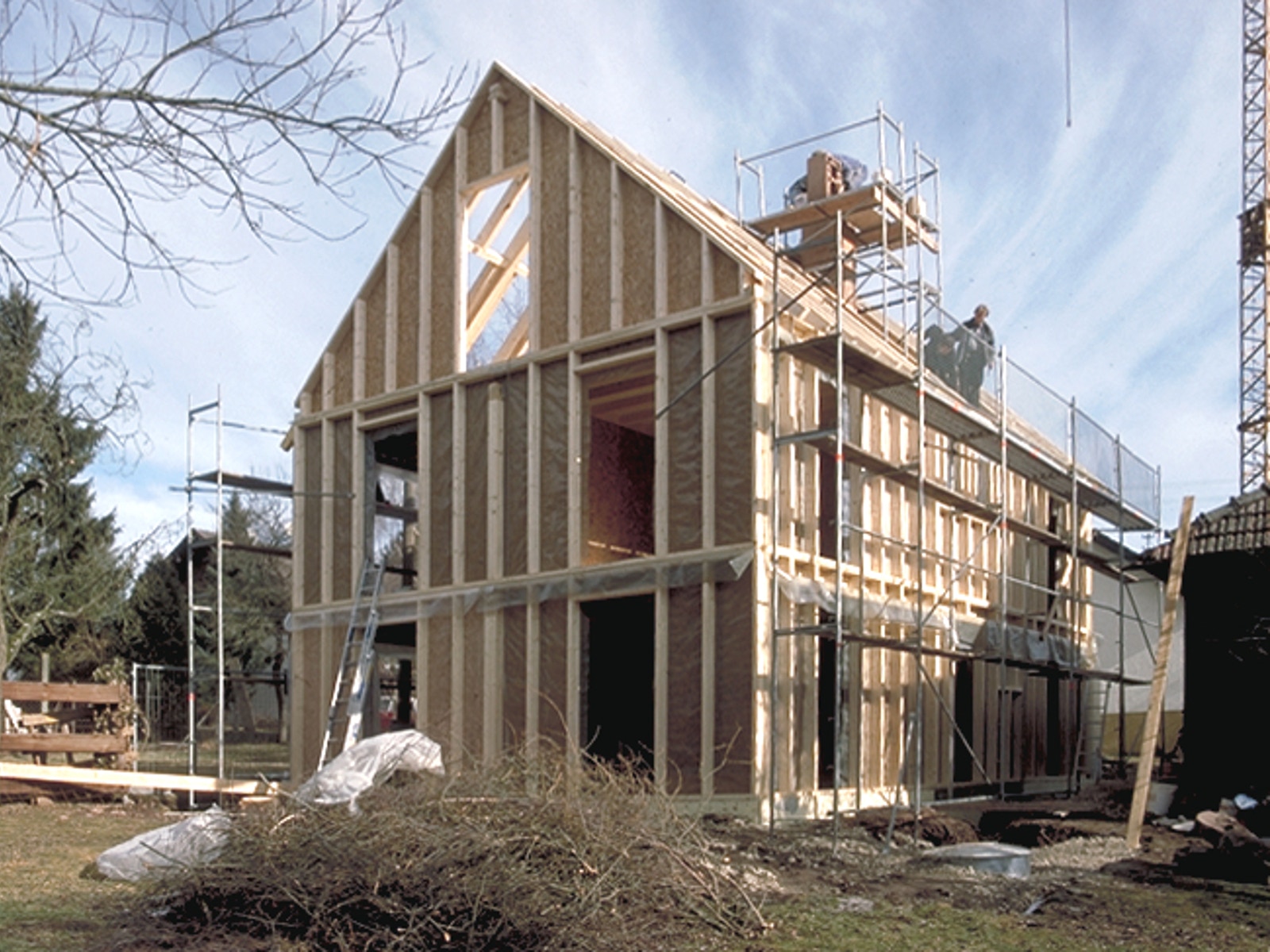 Die Grundkonstruktion wurde als Holzständerbau individuell entworfen und konnte aufgrund der einfachen Geometrie in der Werkstatt vorgefertigt und innerhalb kürzester Zeit aufgestellt werden.