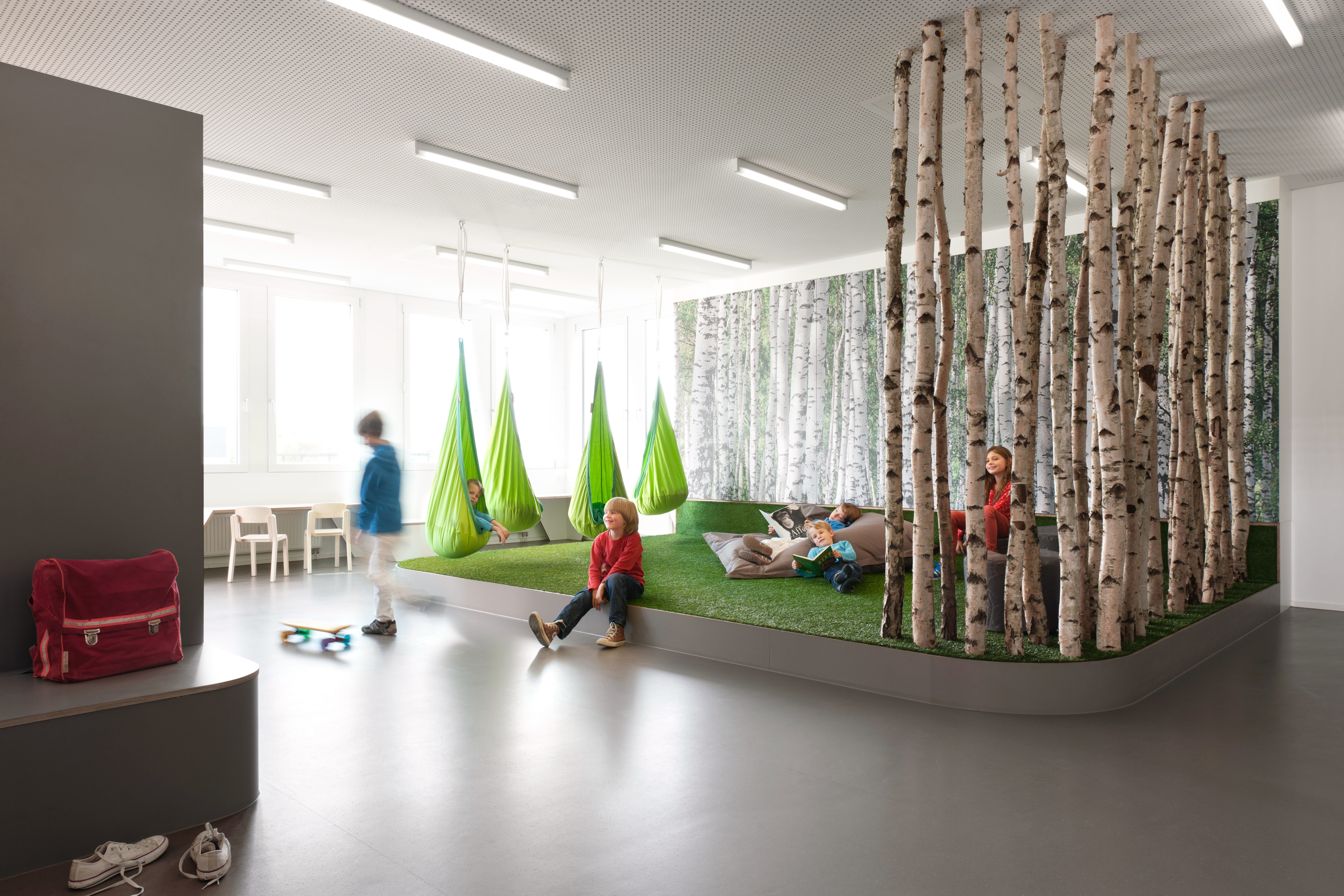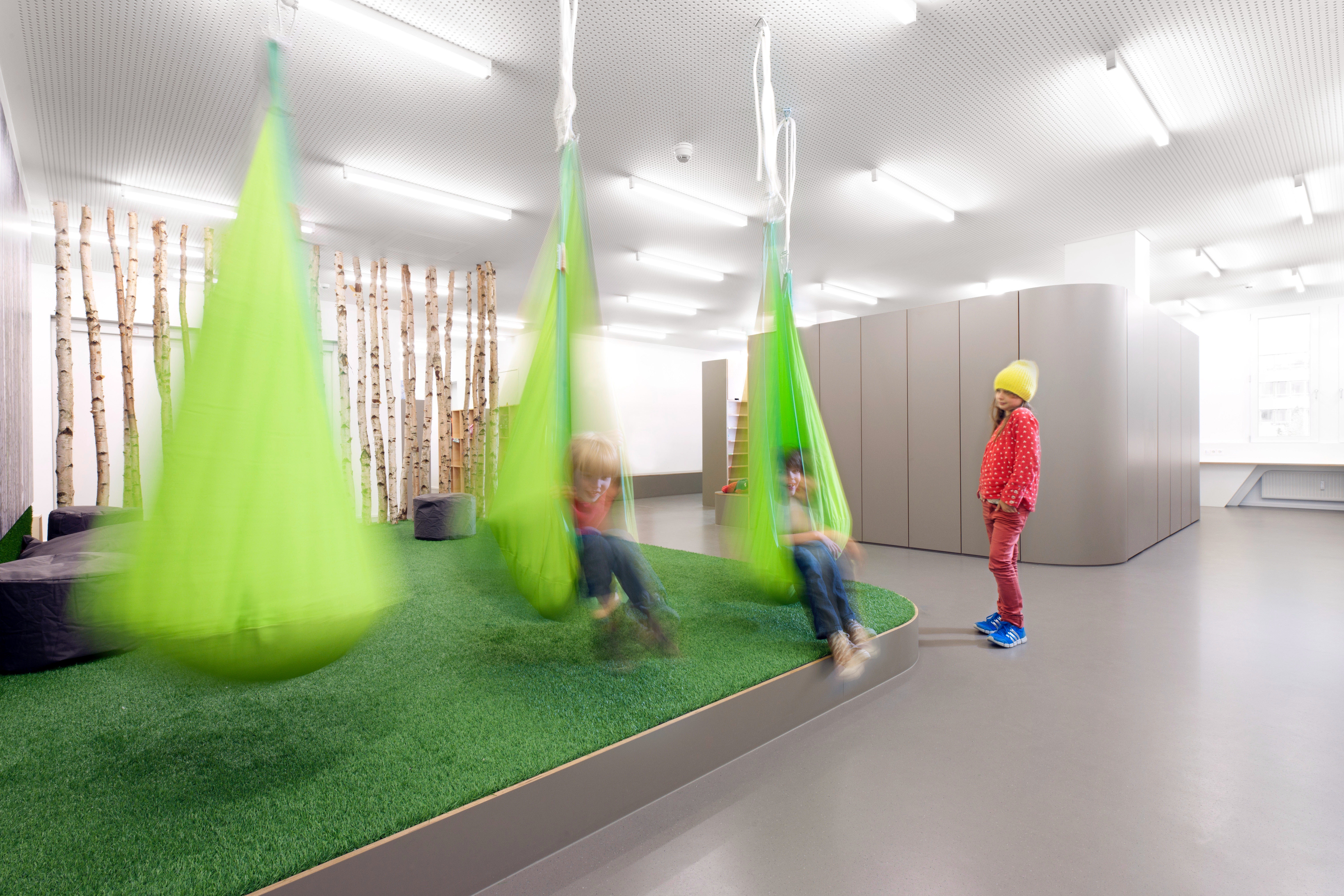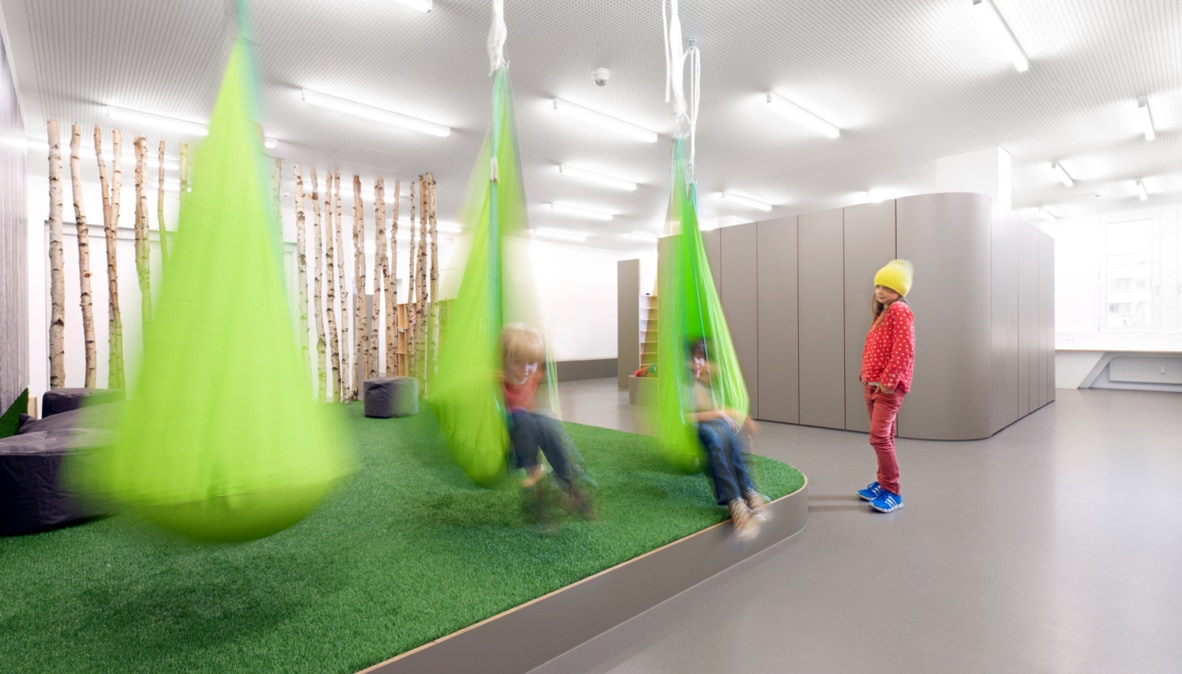 Die zur Verfügung stehende Bürofläche wurde bis auf die Technikkerne komplett entkernt. Es entstanden zwei große Räume, in denen freistehende Einbauten, entsprechend dem pädagogischen Konzept der Schule, unterschiedliche Tätigkeiten unterstützen. Der Aktionsbereich, mit Garderobe, Labor, Atelier und Bewegungsraum sowie der Arbeitsbereich mit zwei differenziert ausgestatteten Lerninseln. Eine raumhohe Schrankwand bietet mit eingebauten Raumnischen (Lesehöhle, Zirbelstube) Rückzugs- und Ruheräume an. Entlang der Fassade befinden sich umlaufend die Einzelarbeitsplätze in unterschiedlicher Höhe, so dass sitzend oder stehend auch individuell gearbeitet werden kann.