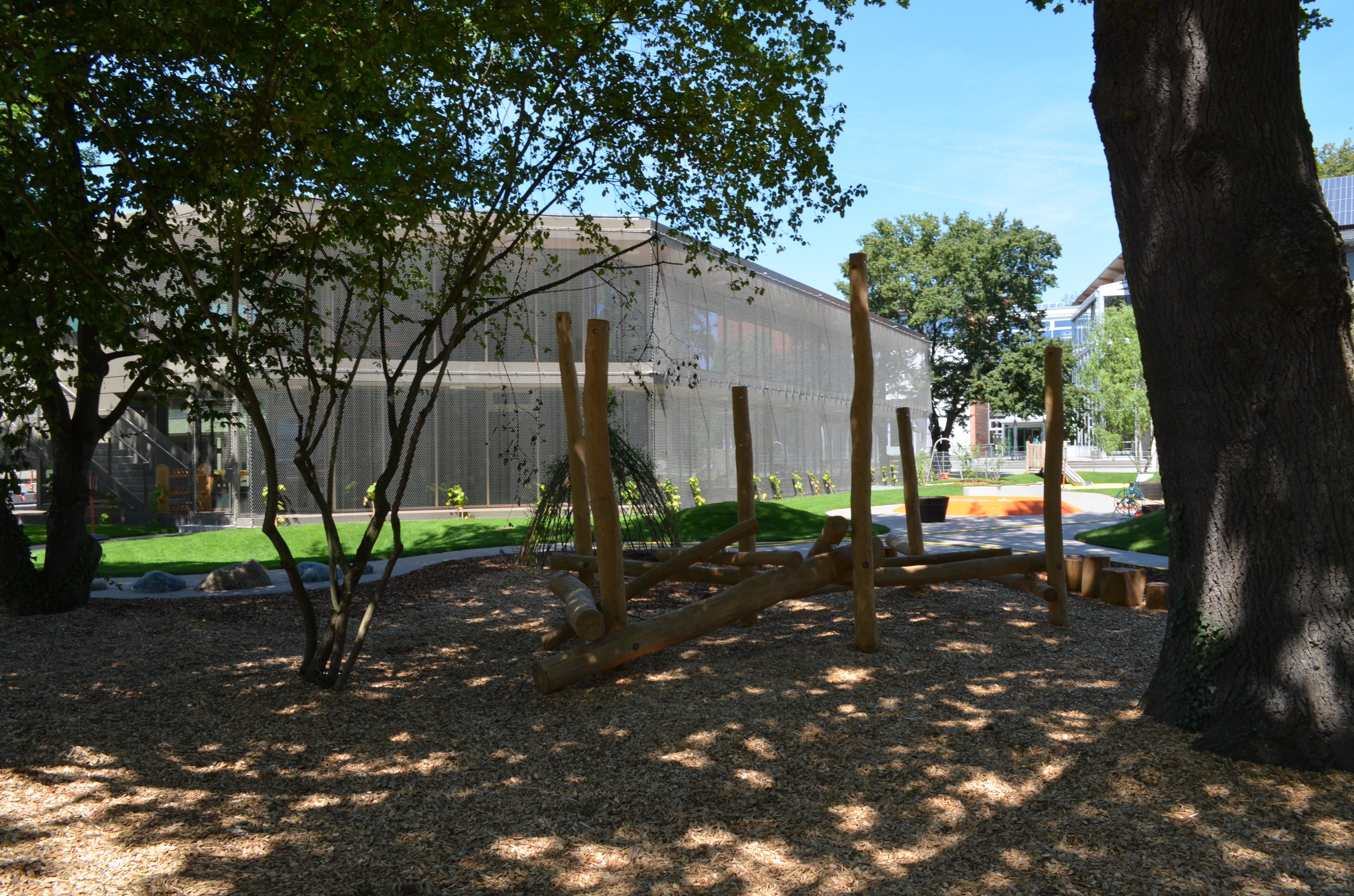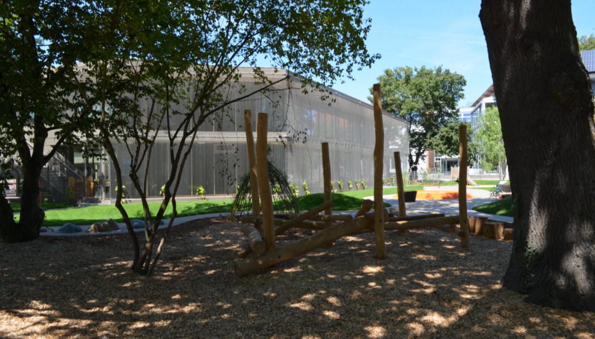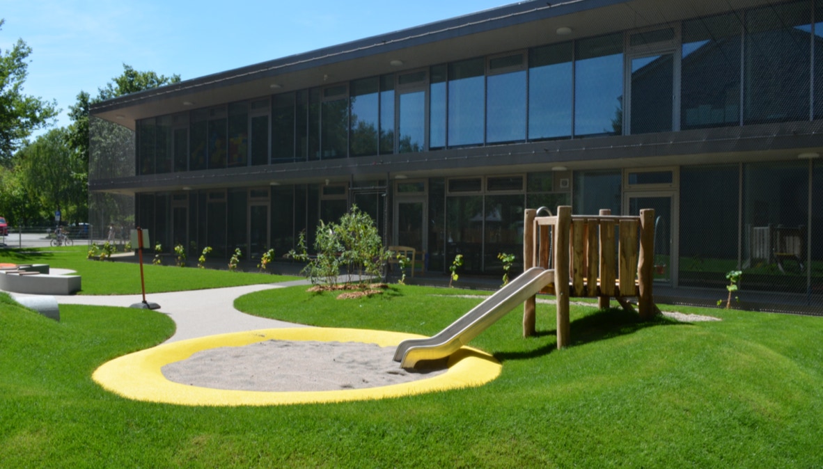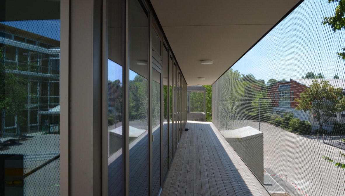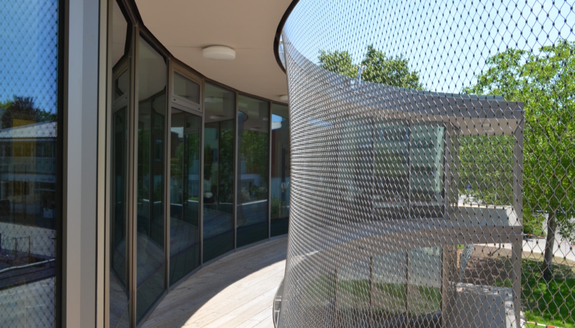Aus dem so entwickelten klaren, scharfkantigen Baukörper mit  einer dominanten Schichtung der Geschosse, wurden Kreissegmente herausgeschnitten, um den alten Baumbestand zu berücksichtigen und in das Gebäude zu integrieren. Um das gesamte Gebäude ist ein Netz aus Edelstahl geschlungen. Dies dient bei freiem Ausblick (auch für Kinder) der Absturzsicherung. Das Netz wurde begrünt und schützt so den Innenraum zusätzlich vor Sonneneinstrahlung.