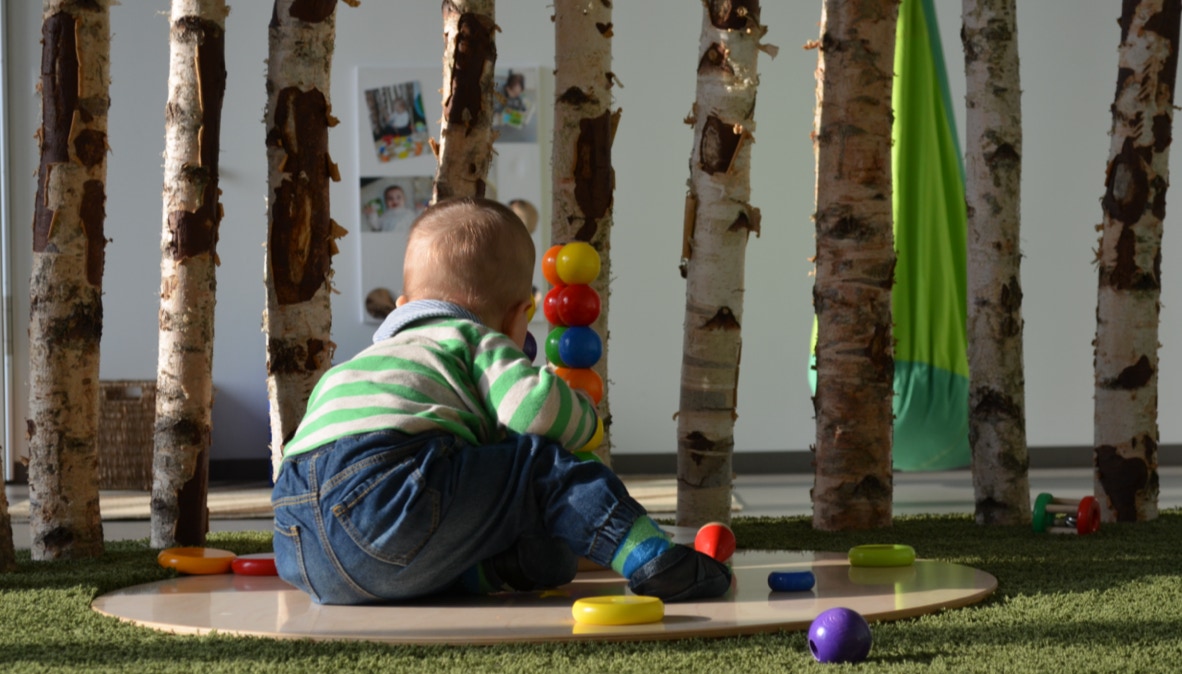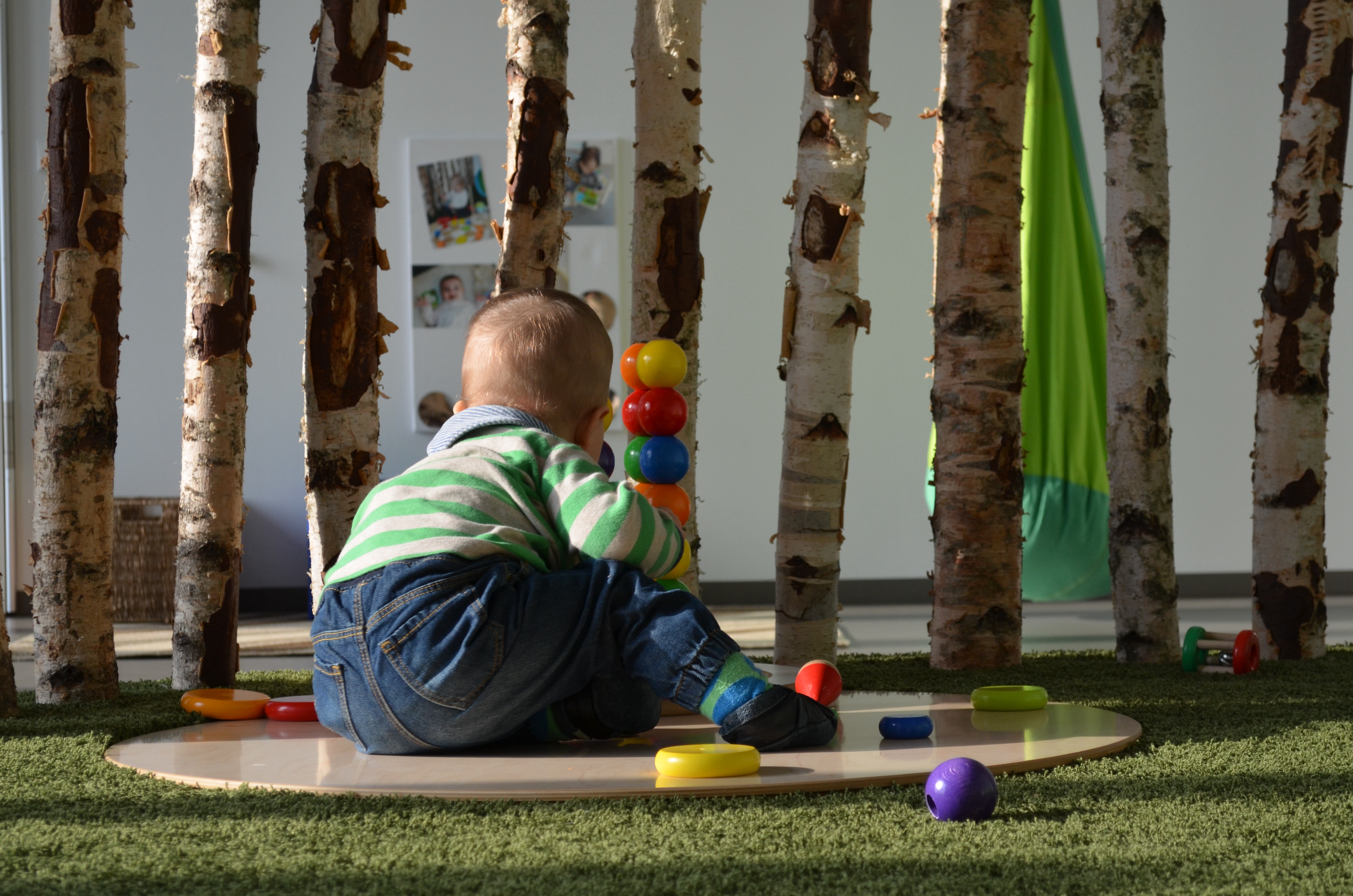 So entstand ein aufeinander abgestimmtes System von Möblierungs-elementen, die sich im Kita-Alltag bewährt haben. Grundmaterial ist eine Mehrschichtplatte aus finnischem Birkenholz, die entweder transparent oder farbig beschichtet, ohne weitere Oberflächen-behandlung zum Einsatz kommt.