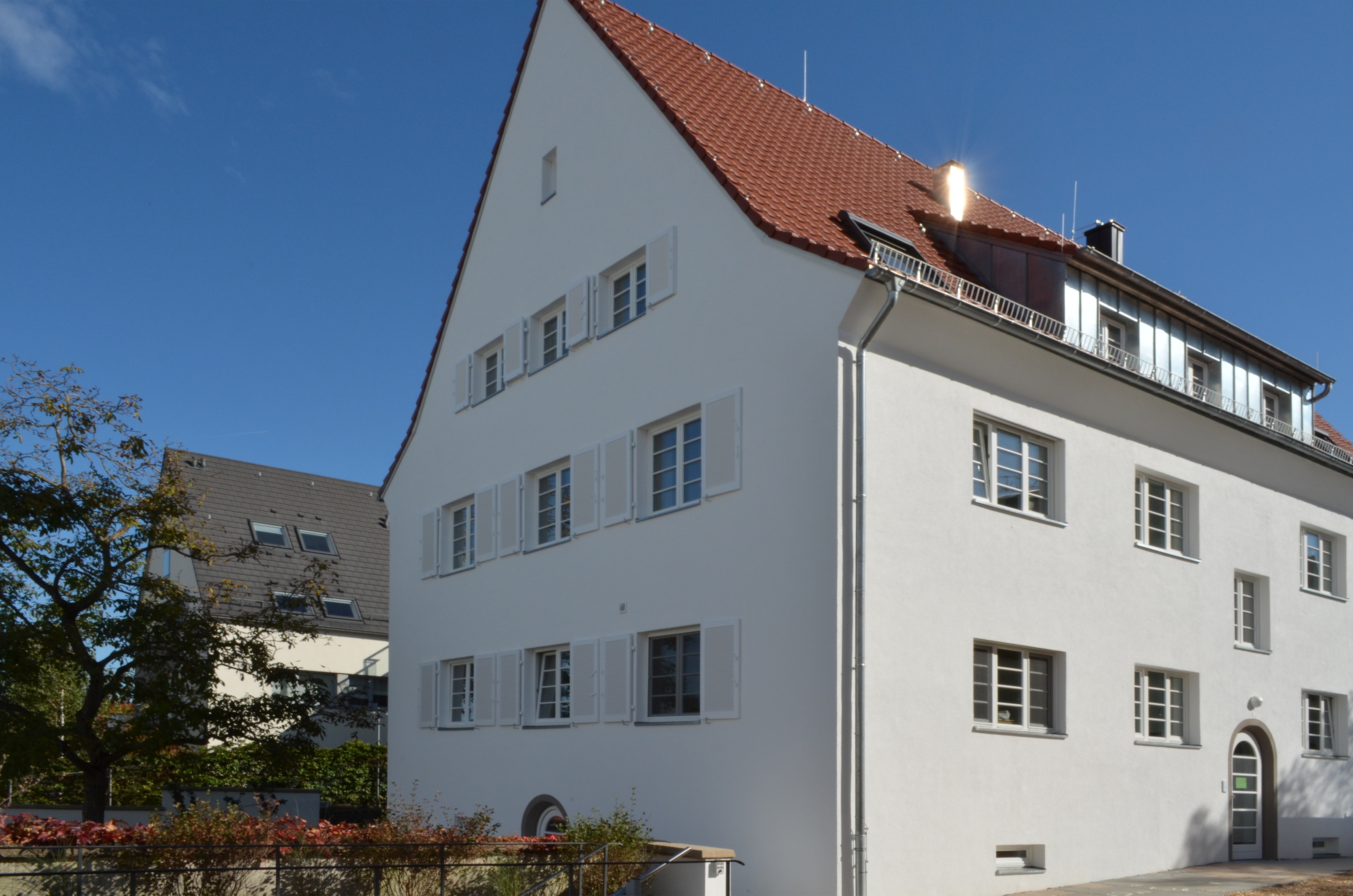 Putzstruktur, Farbgebung, Ausbildung der Dachanschlüsse, sogar die Sprossenteilung der Fenster wurden übernommen, so dass der Charakter des Hauses weitest gehend erhalten blieb.