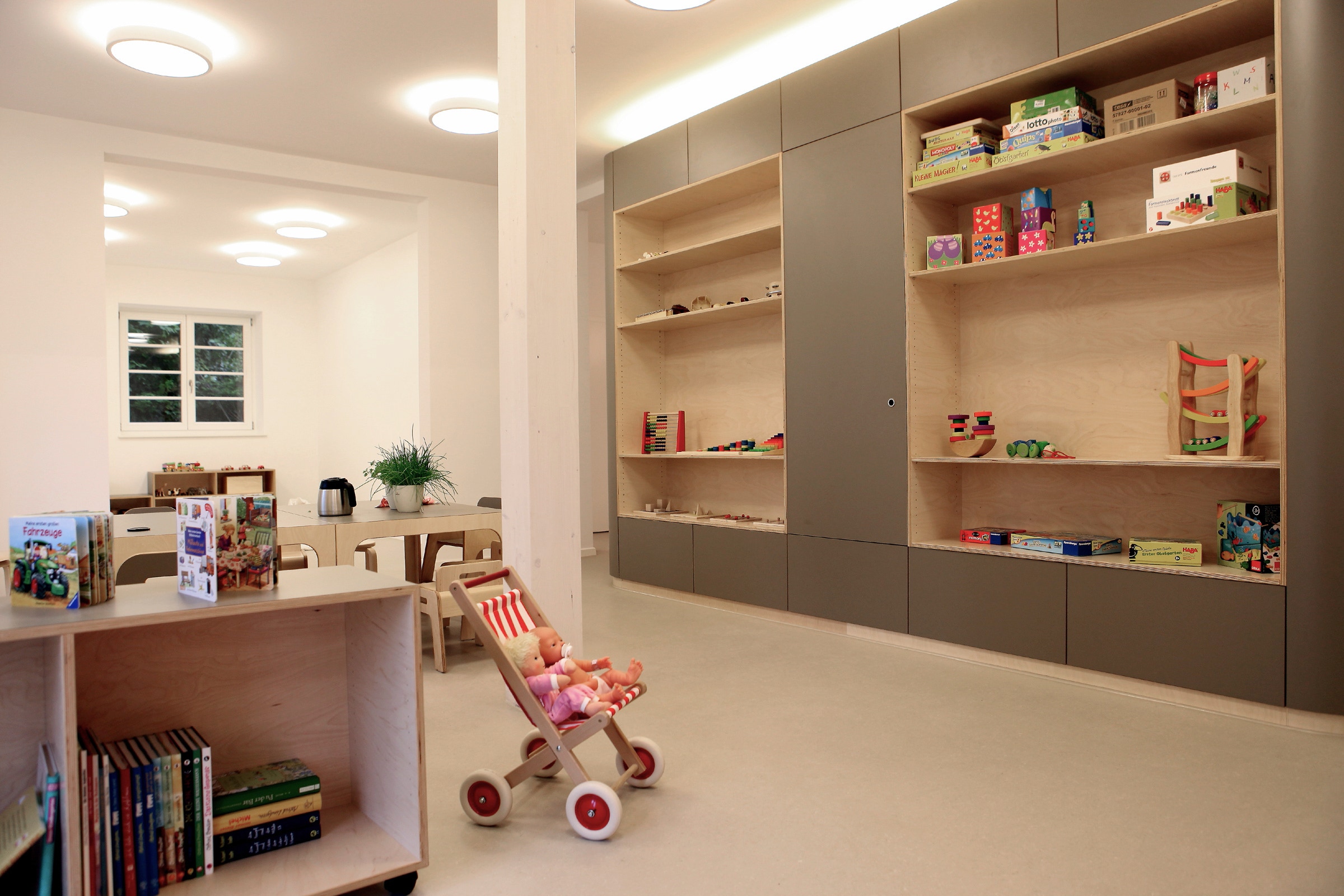 Die kleinteilige Struktur der früheren Wohnnutzung konnte dabei weitestgehend in die differenzierte Nutzung der Funktionsräume (Bauen, Labor, Atelier, etc.) überführt werden. Lediglich für die zentralen Bereiche Marktplatz und Bewegungsraum wurde die Bestandsstruktur zu Gunsten großer Räume durchbrochen.