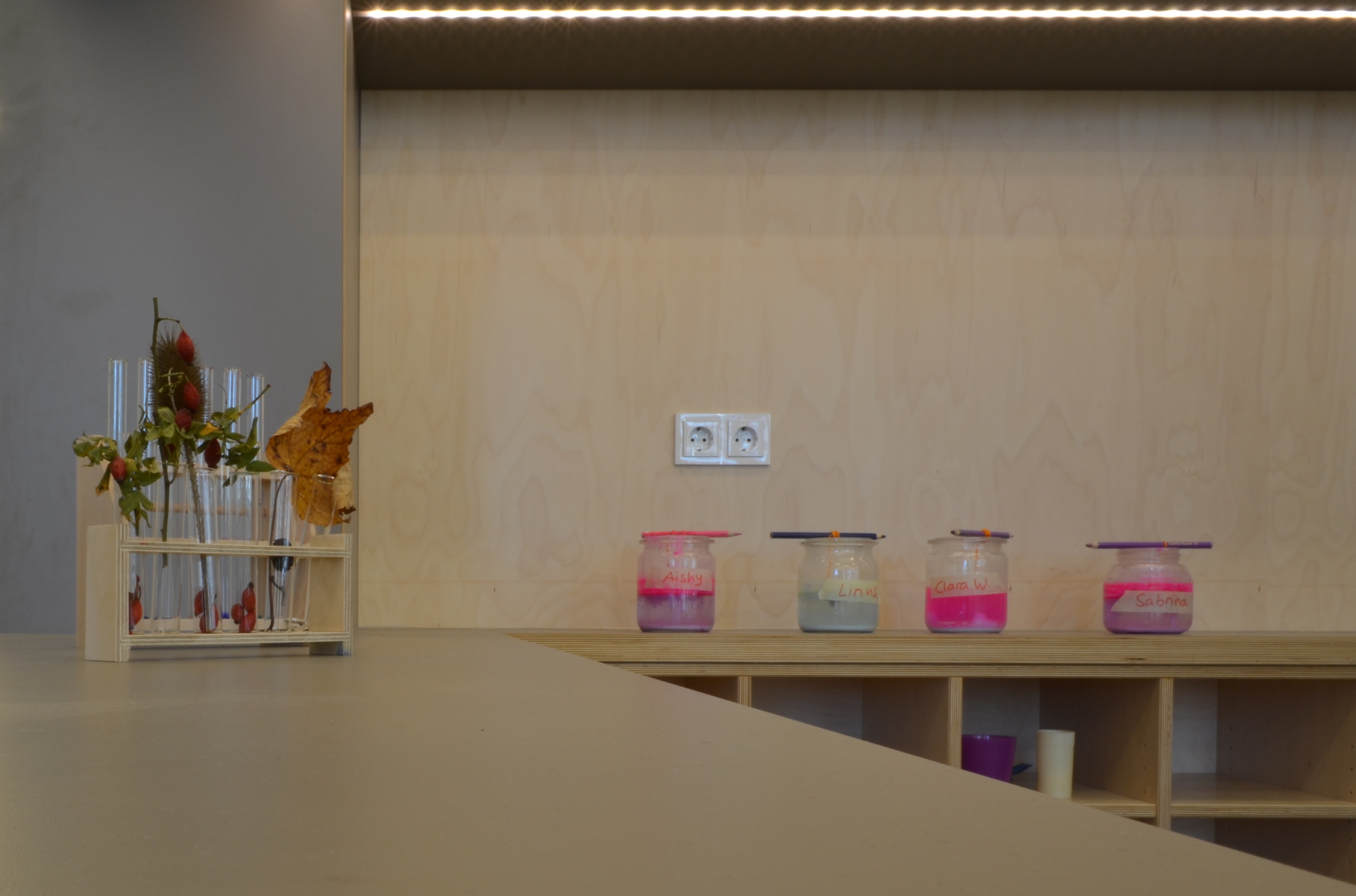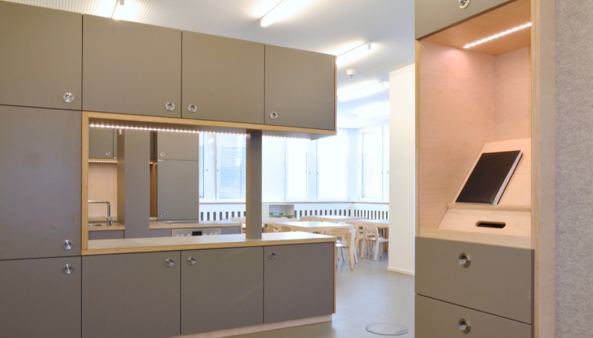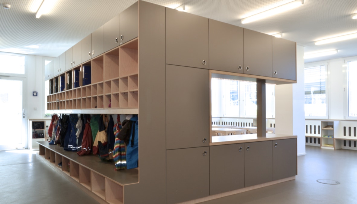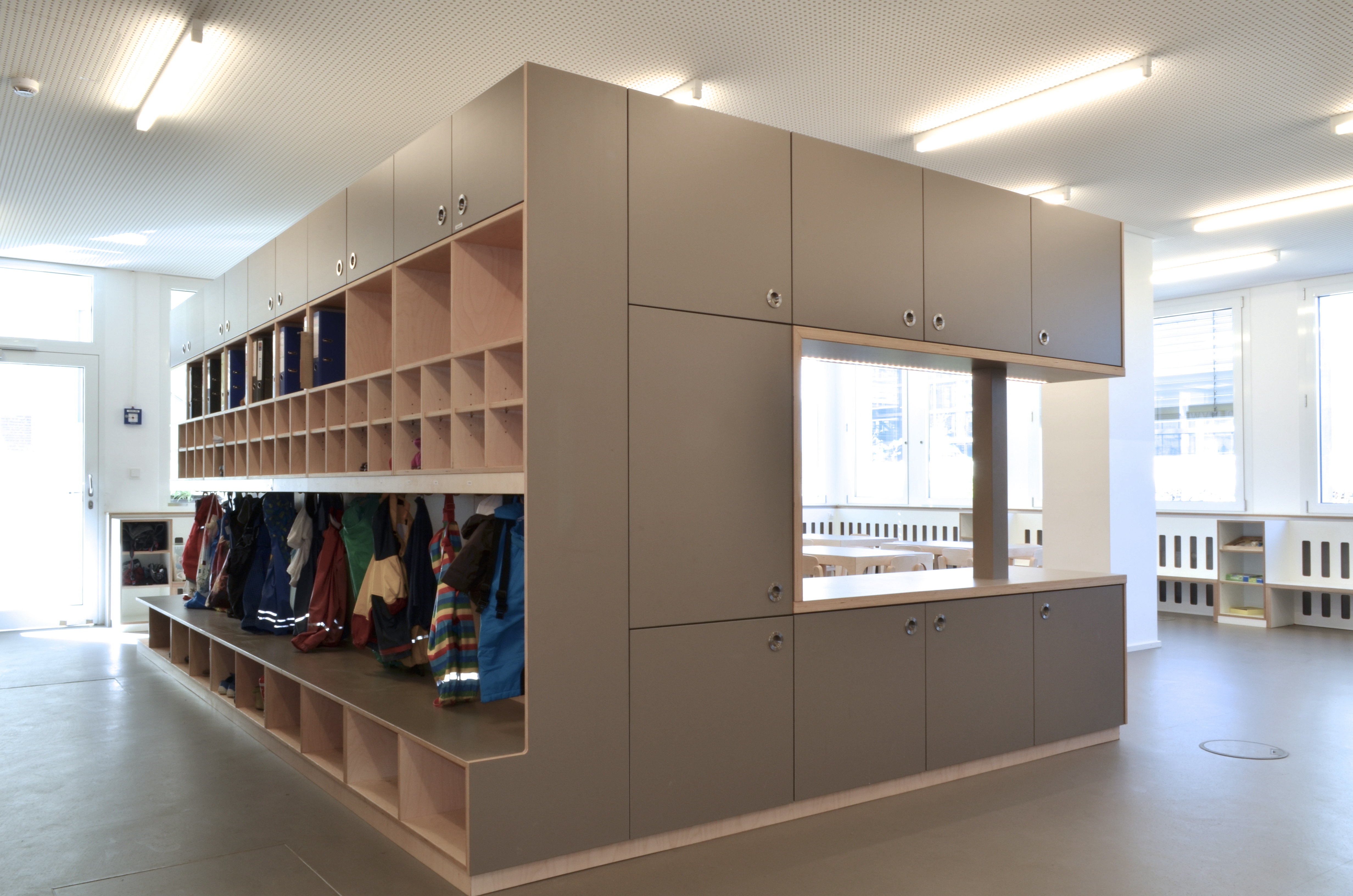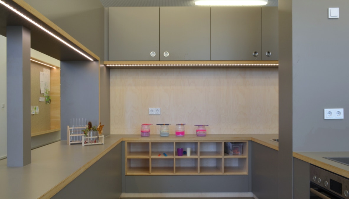 Das Raumkonzept wurde in Anlehnung an die Gestaltung der Grundschule im 2. Obergeschoss entwickelt. Der große Eingangsraum ist mit einem zentralen halbhohen Einbaumöbel, dass die Funktionen Garderobe, Küche und Labor anbietet, in Raumzonen unterteilt. Die Garderobe begrenzt den Eingangsraum, die Küche ist zum Marktplatz hin ausgerichtet.