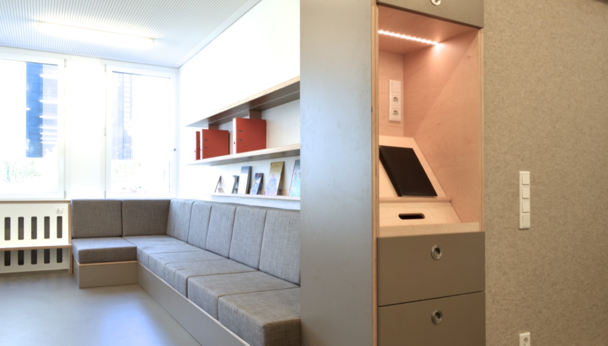 Ein großes Sitzmöbel lädt zum entspannten Studium der Portfolios ein, ein Infopoint mit Stehpult und Aushang dient dem Austausch der ErzieherInnen untereinander.