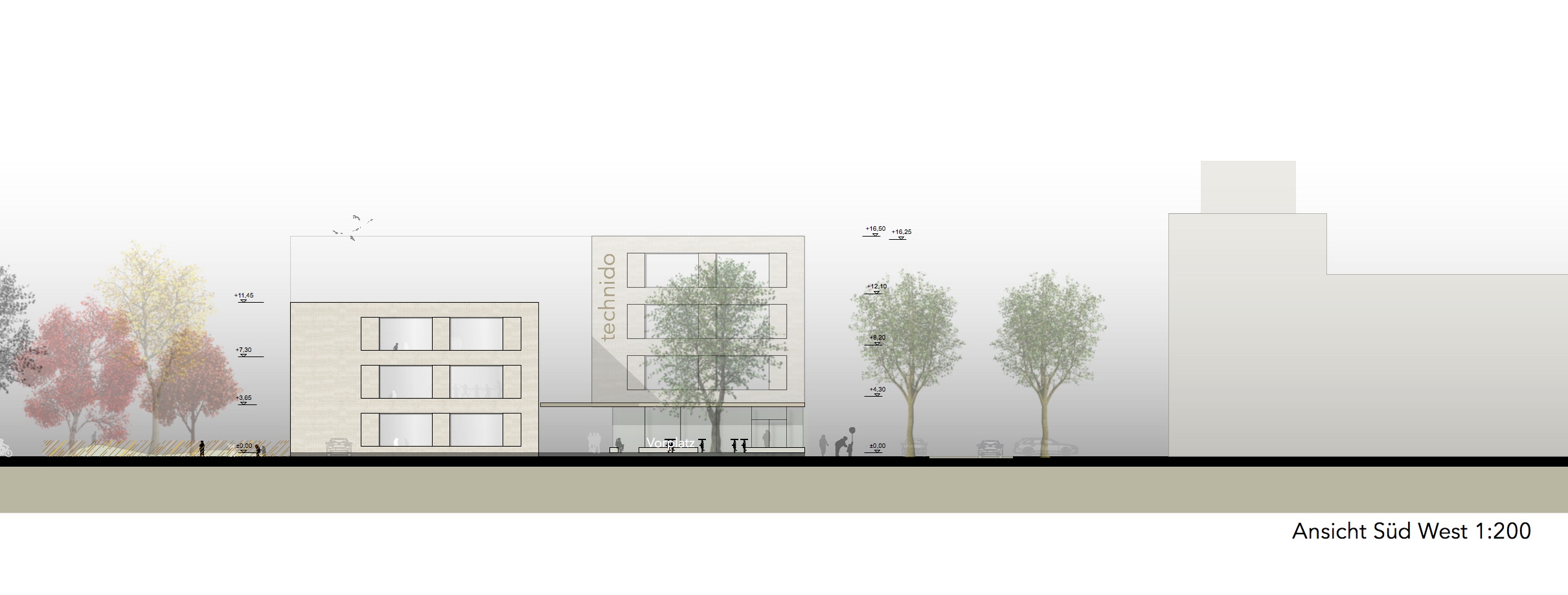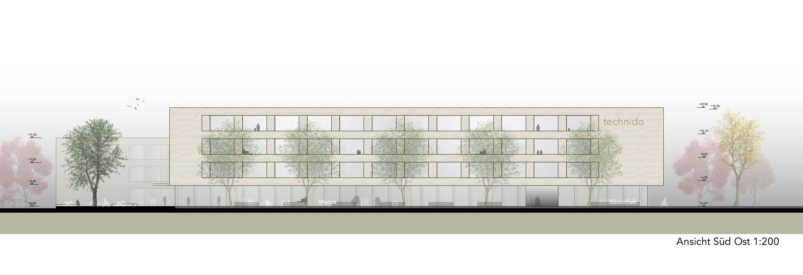 Beide Gebäudeteile präsentieren sich zur Konrad-Zuse-Straße mit einer geschlämmten Ziegelfassade in einem hellen grau-beigen Farbton. Fensterbänder entlang der Flure gliedern die Fassade horizontal und prägen das Erscheinungsbild nach außen. Wandscheiben gliedern die Bänder. Eingefasst in einen eloxierten Aluminiumrahmen dienen sie, als vor die Lüftungsflügel gesetzte Blindelemente, der Absturzsicherung während der Lüftungsperioden. Eine Fassade, die auch in der Nahsicht lebendig wirkt und das Handwerkliche hervorhebt.
