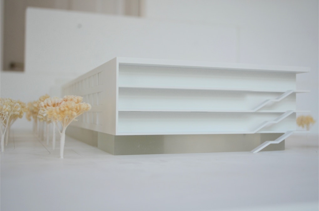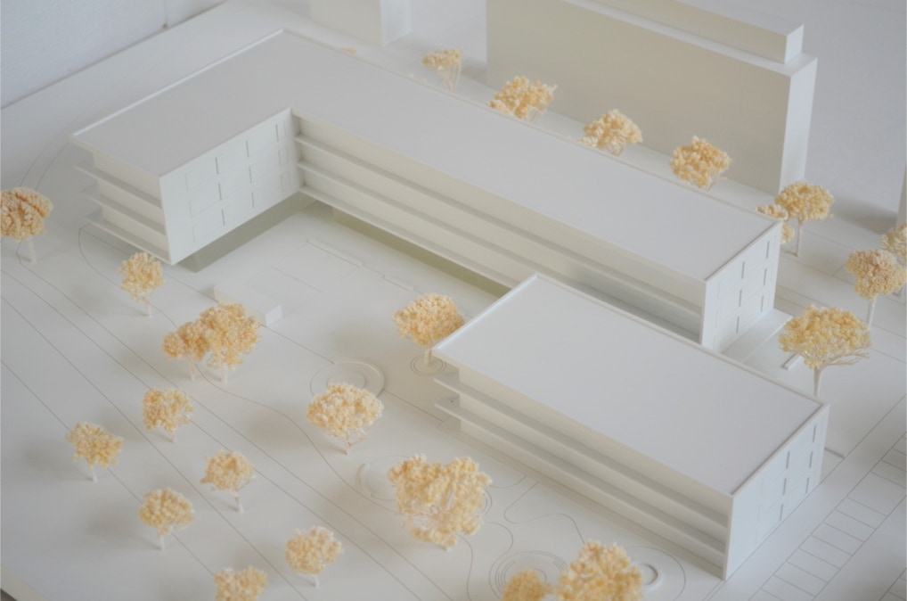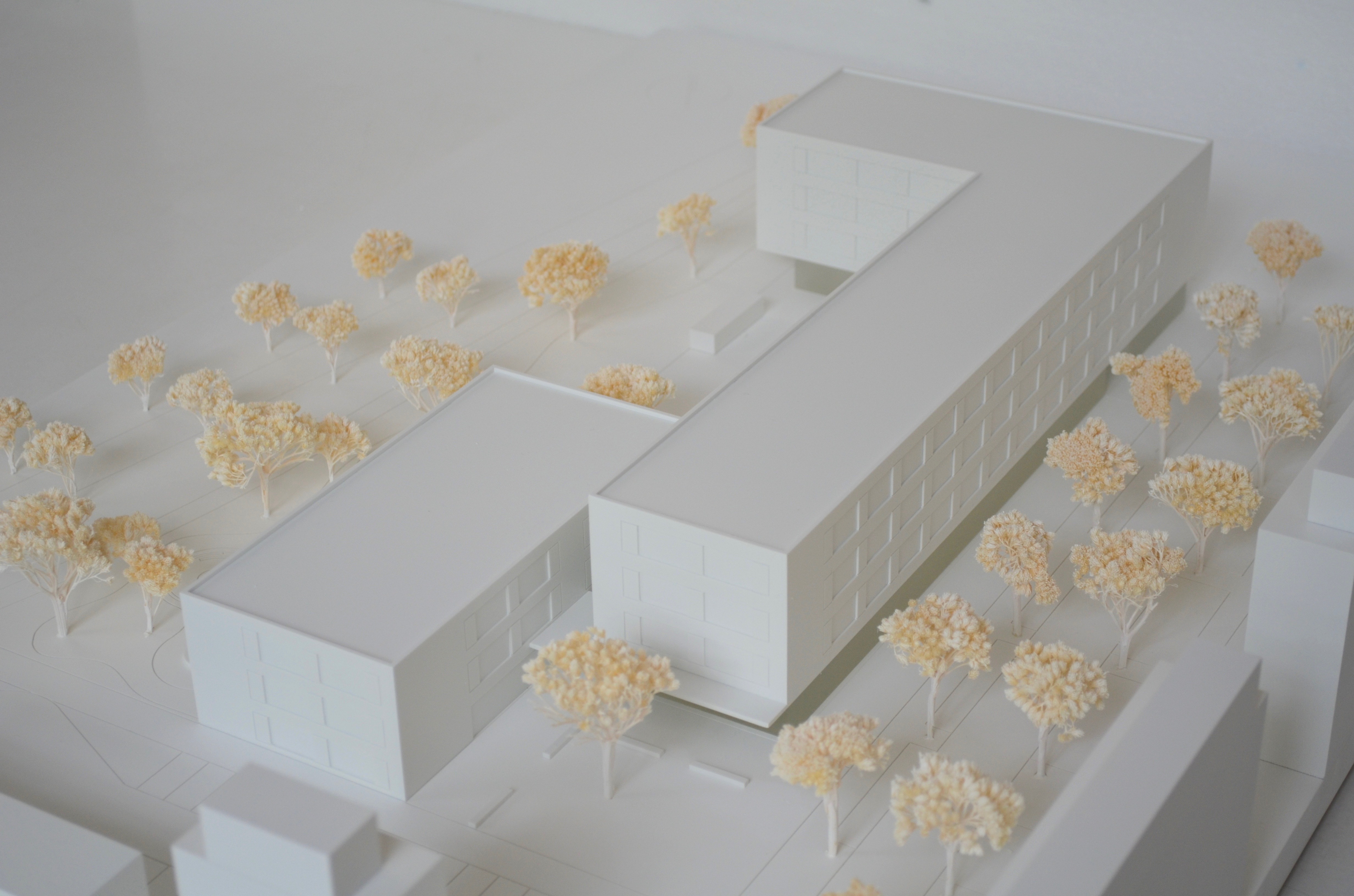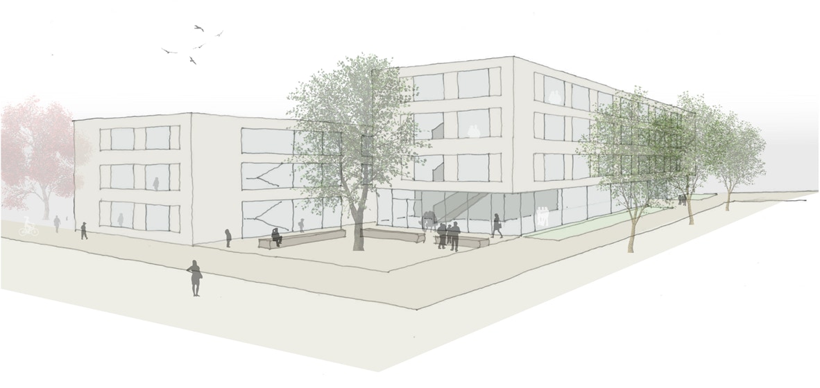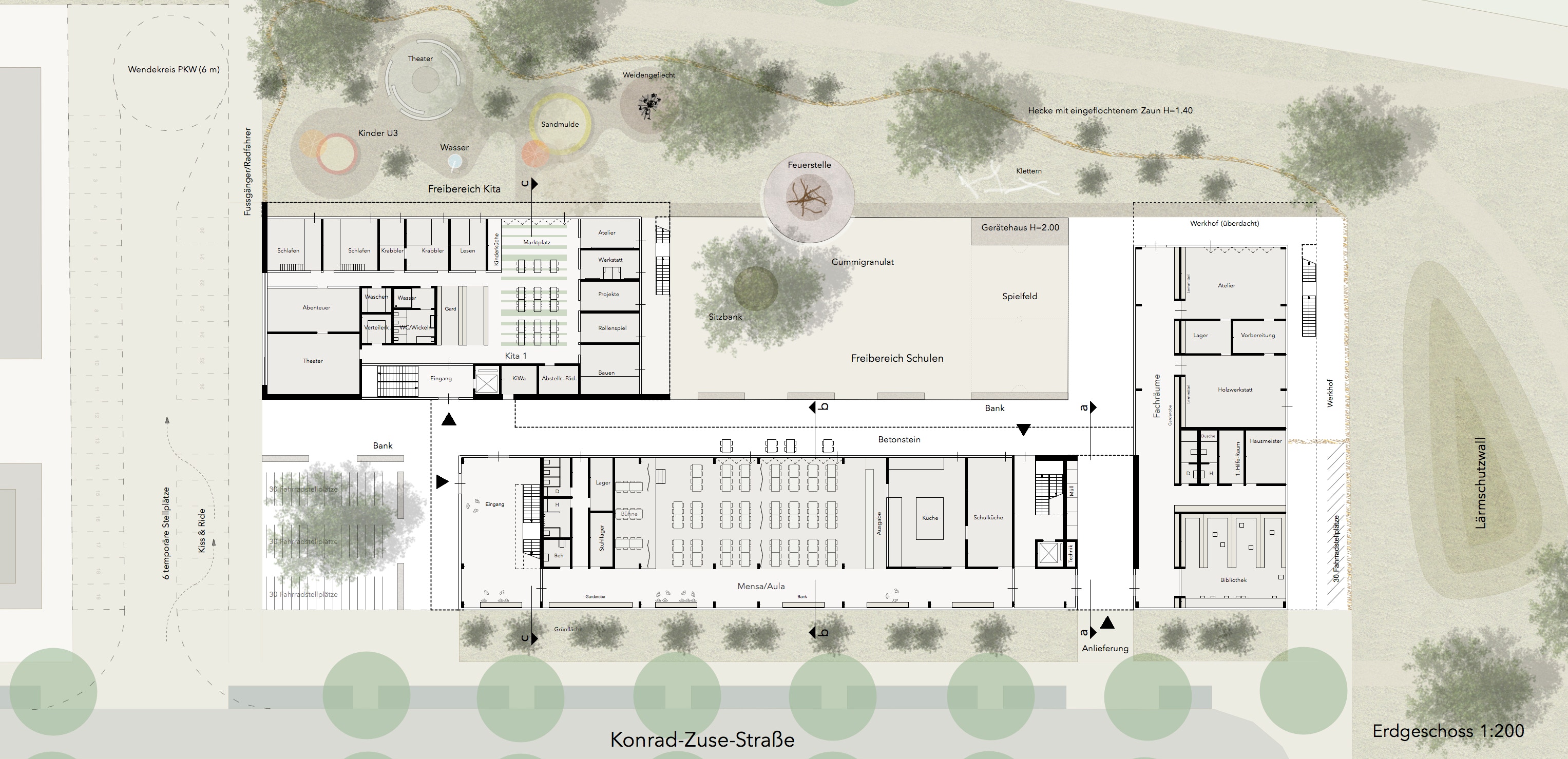Der 4-geschossige, L-förmige Baukörper der Gemeinschaftsschule übernimmt die geplante Gebäudeflucht entlang der Konrad-Zuse-Straße und umschließt das Areal auch auf der Nordseite. Der 3-geschossige Baukörper der Grundschule und Kindertagesstätte bildet den südwestlichen Abschluss und vermittelt in Höhe und Form zu der geplanten Bebauung in zweiter Reihe sowie zum Grünstrahl.