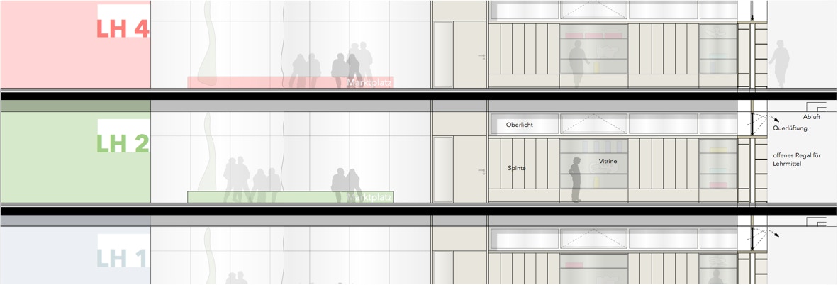Die klare räumliche Zuordnung der Lernhäuser pro Geschoss und Gebäudeflügel erlauben eine gute Orientierung im Gebäude. Ein großzügiger Flur erschließt das Raumangebot und bietet Platz für das Ankommen (Garderobe/Spinte) sowie für Austausch und Interaktion zwischen den Schülern. Er ist Teil des Lernumfeldes und weit mehr als nur Erschließung. Eine Bank entlang des Fensterbandes lädt zum Verweilen ein, Seitenlichter erlauben den Ein- und Ausblick in die Lernräume, in die Zwischenwand integrierte Vitrinen bieten Platz für Ausstellungen.