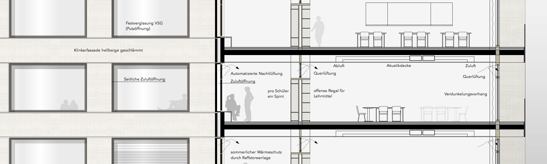 Die Lernräume selbst haben in der Regel einen nahezu quadratischen Grundriss, der insbesondere für freie Lernformen Vorteile in der Möblierung bietet und eine große Vielfalt an Möblierungsvarianten zulässt.