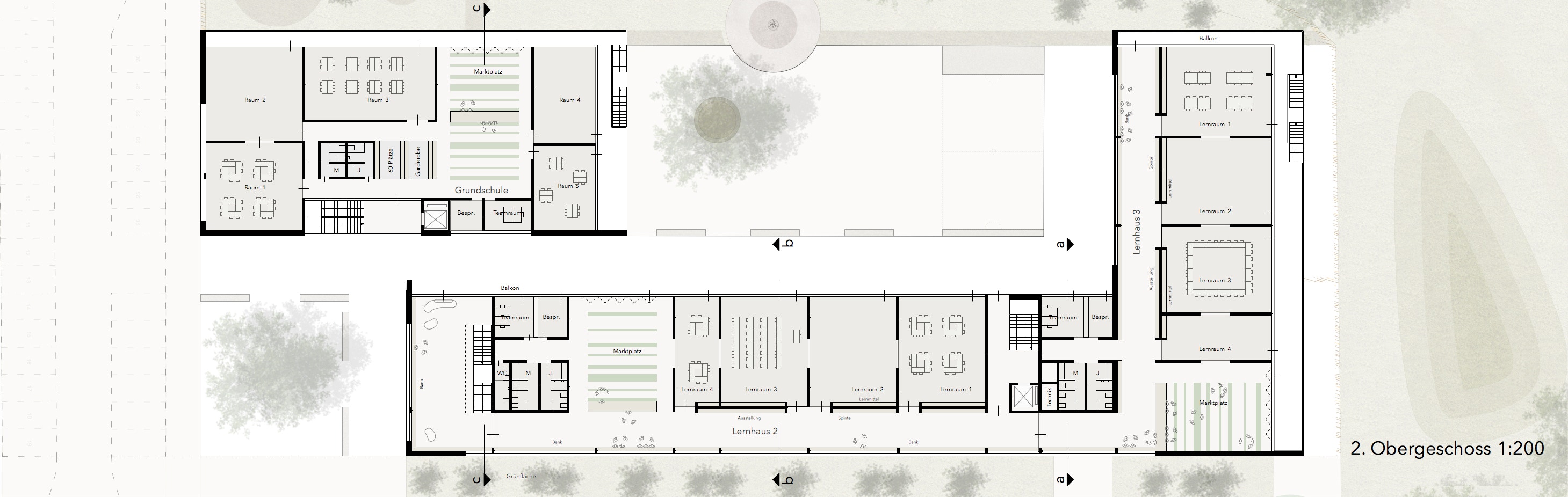 Im Winkel beider Baukörper entsteht ein Vorplatz, der Ankunftsort, Treffpunkt und Adresse für den neuen Gebäudekomplex ist. Er versteht sich als Bindeglied zwischen dem städtischen Umfeld und dem Bildungshaus, ist Wartebereich für das Abholen sowie Ort des Austausches, insbesondere für ältere Schüler. Er ist Treffpunkt und Verteiler zu den Haupteingängen der Gebäudeteile.