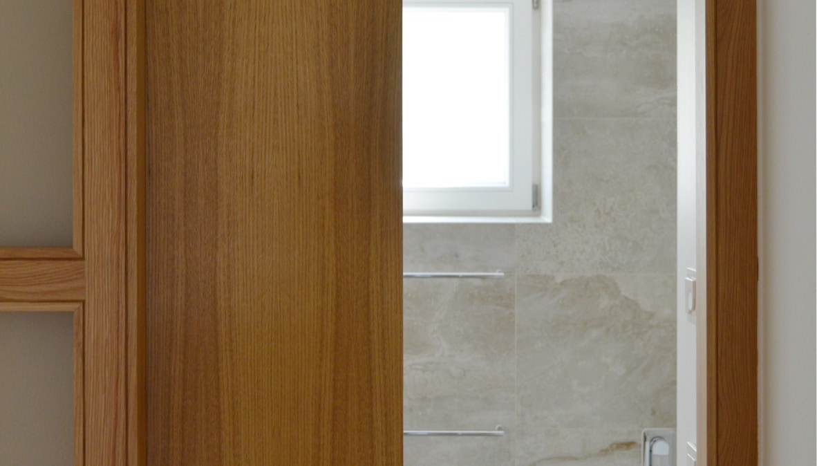 Ein kleines Bad, das bisher als Durchgangsraum zu den Schlafräumen diente, wurde separat erschlossen und mit einer Schiebewand aus Eichenholz und Glaselementen vom Flurbereich getrennt. Glasflächen, Muschelkalk und Eichenholz bestimmen den Raum.