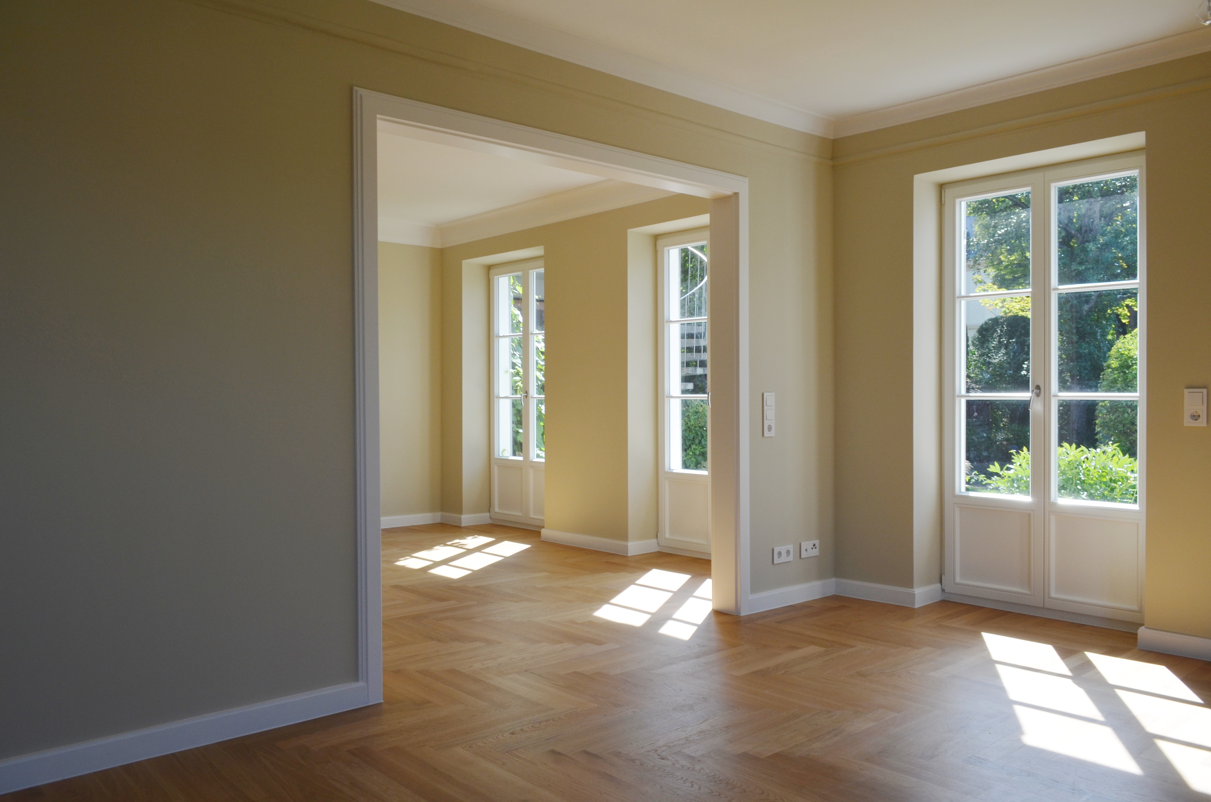 Konstruktion: Fussbodenheizung, Eichenparkett Fischgrät, Holzfenster, Kassettentüren, Natursteinfliesen