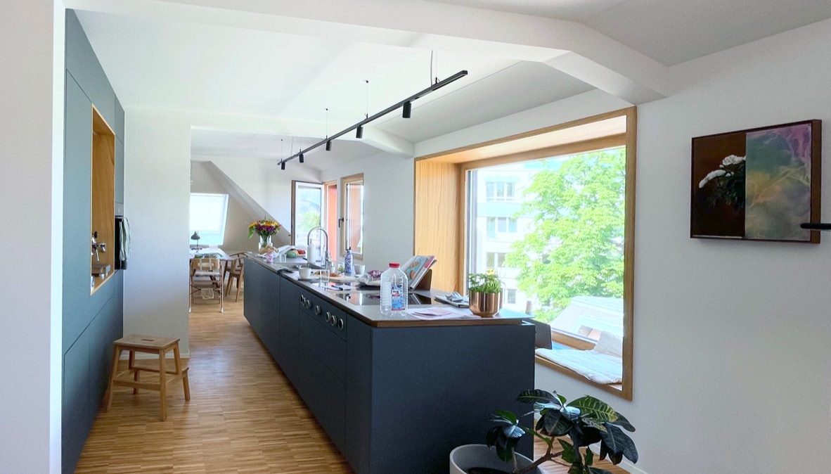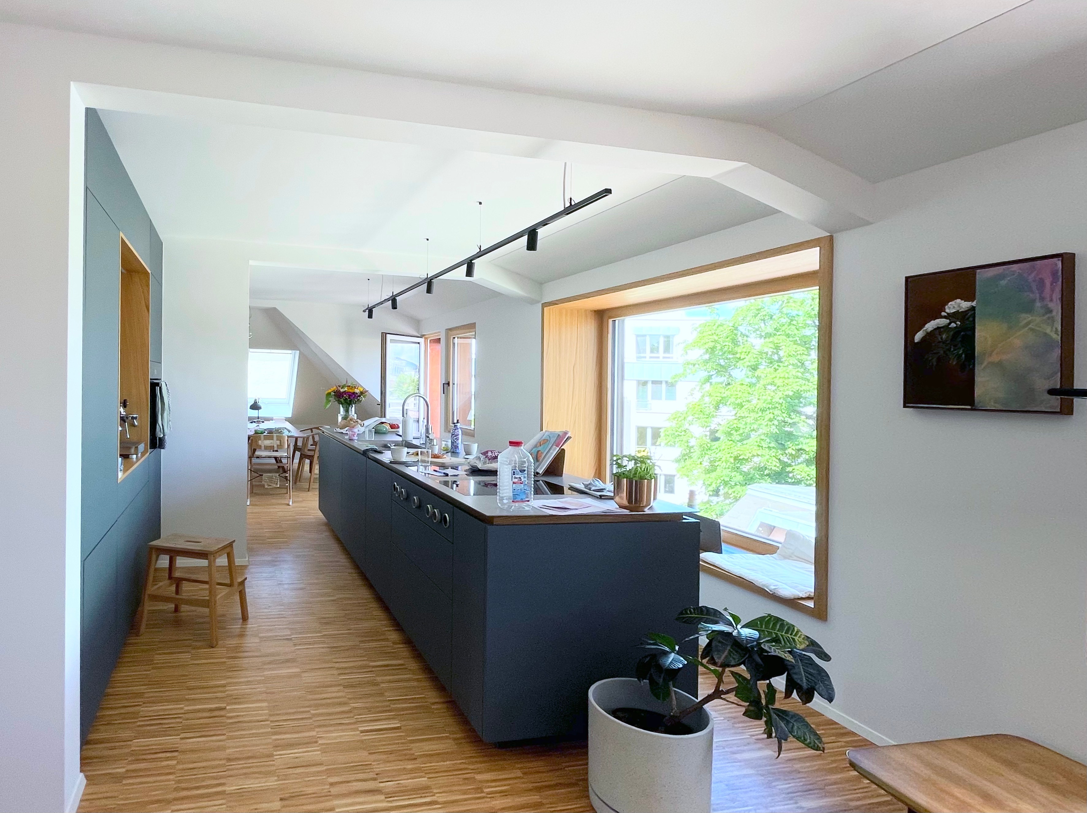 Die kleinteilige Raumstruktur im 1. Dachgeschoss konnte bis auf wenige aussteifende Wände zu einem Wohn- und Essbereich zusammengefasst werden. Ein Panoramafenster gegenüber des Küchenblocks öffnet den Blick auf die Dächer Cannstatts.