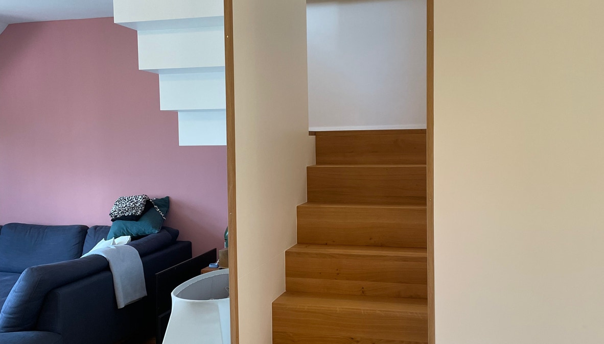 In einem Mehrparteien-Wohnhaus am Rande der Altstadt Bad-Cannstatts wurde das 1. mit dem 2. Dachgeschoss über eine interne Treppe gekoppelt und zu einer Wohneinheit ausgebaut.