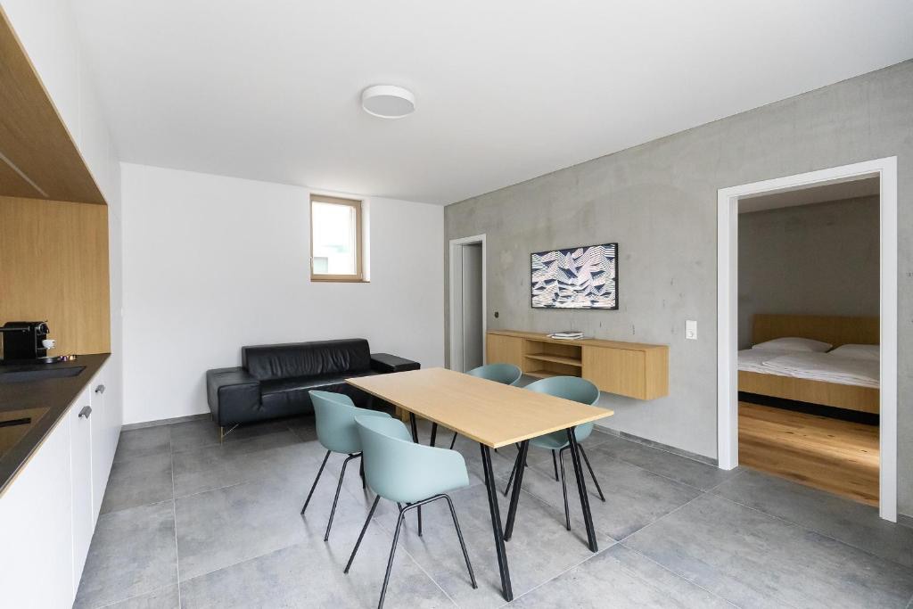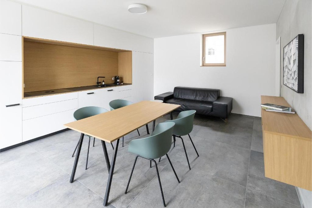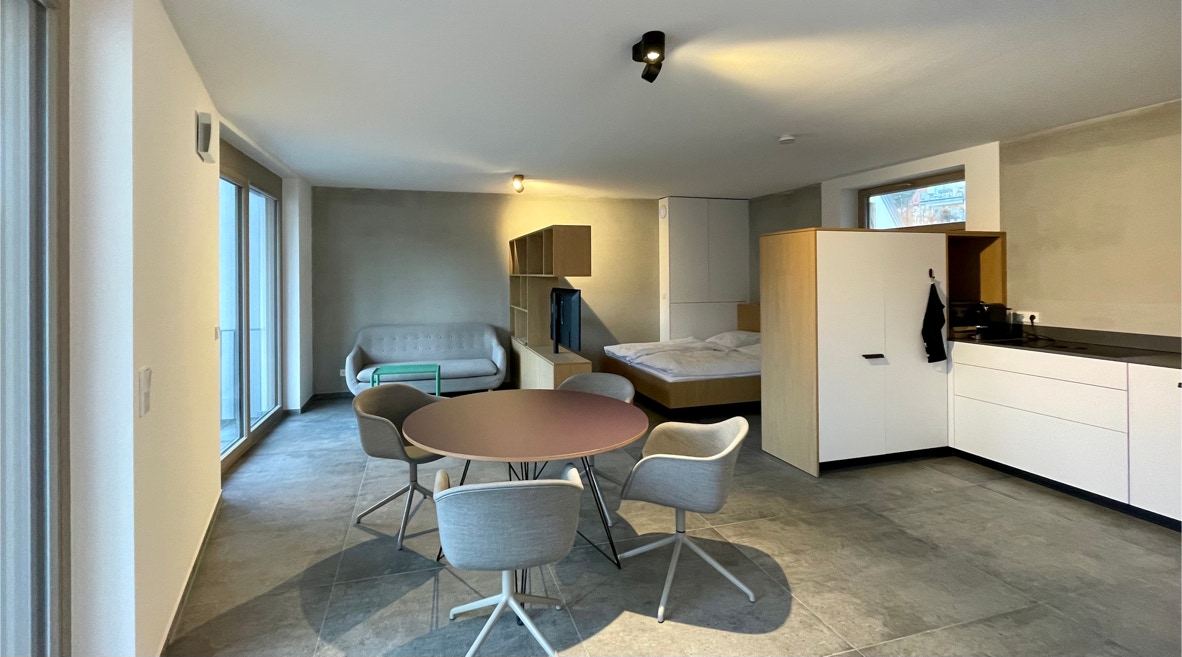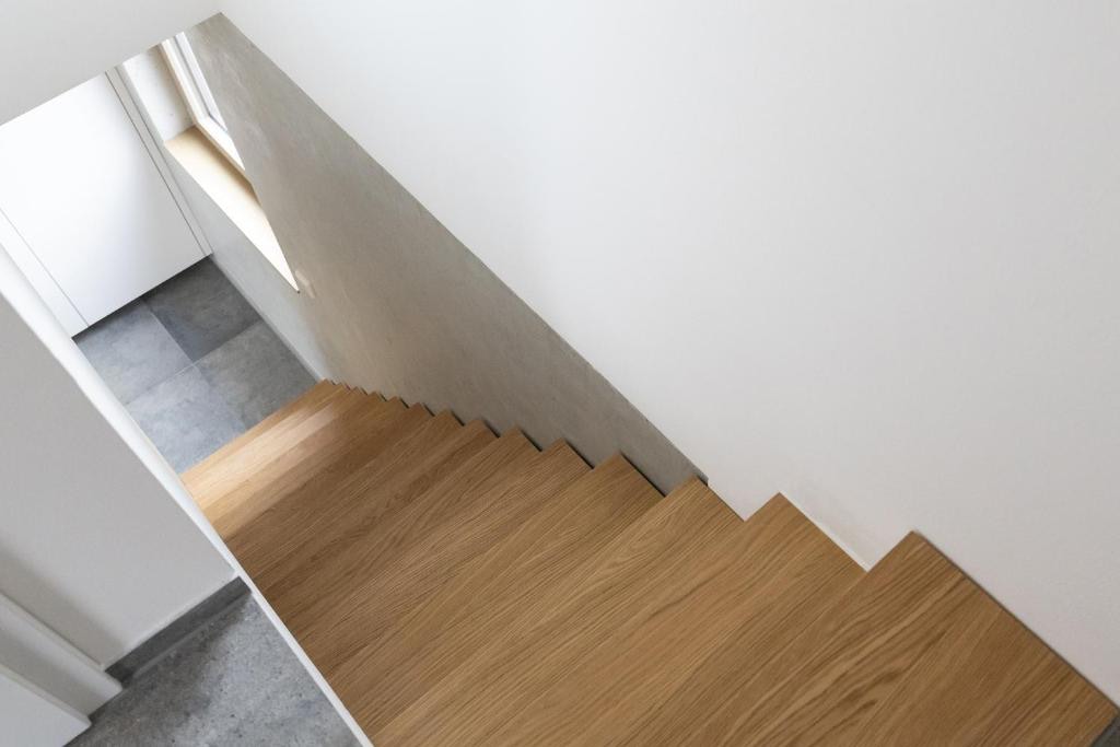 Entlang einer mäandrierenden Treppenanlage wurden die 3 Einheiten von aussen erschlossen. Bodentiefe Fenster öffnen den Blick in die Altstadt. Jede Einheit wurde individuell organisiert, mal als Großraum, mal mit separatem Schlaf- und Sanitärbereich.
