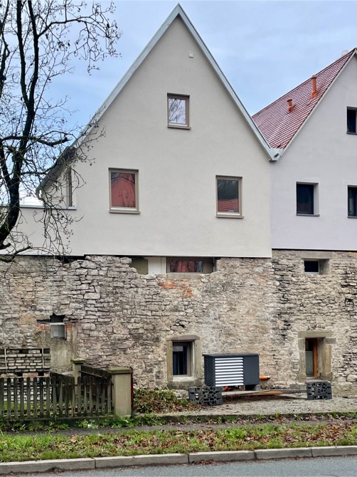 Die unter Denkmalschutz stehende Stadtmauer konnte so in die Gebäudestruktur integriert werden, das nahezu keine Anpassungen notwendig wurden und der Neubau mit dem Nachbargebäude ein kleines Ensemble bildet.